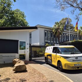 The day in Canberra began with a practical stop for the ID. Buzz: a tyre check at JAX Tyres, Giti Tire’s distribution partner in Australia, to prepare properly for the long crossing of the Nullarbor Plain. Before tackling this legendary stretch, we decided to replace the two front tyres for the first time – a small investment in safety ahead of thousands of almost ruler-straight kilometres. Around midday, there was just enough time for a brief visit to Beate Grzeski, the German Ambassador to Australia, who had graciously received us once before on a previous trip.