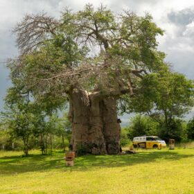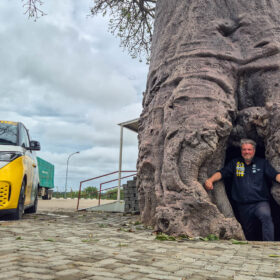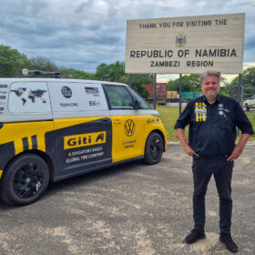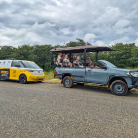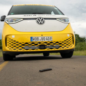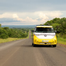 One of the true highlights of the VW ID. Buzz world tour awaited us just beyond Nata. Right beside the national road lies Elephant Sands Camp, where we encountered our first male elephant. With remarkable calm, he wandered around the waterhole, entirely undisturbed. We took the opportunity to capture the iconic GTI Tyres brand image from various angles — a powerful fusion of wildlife, landscape, and modern mobility.